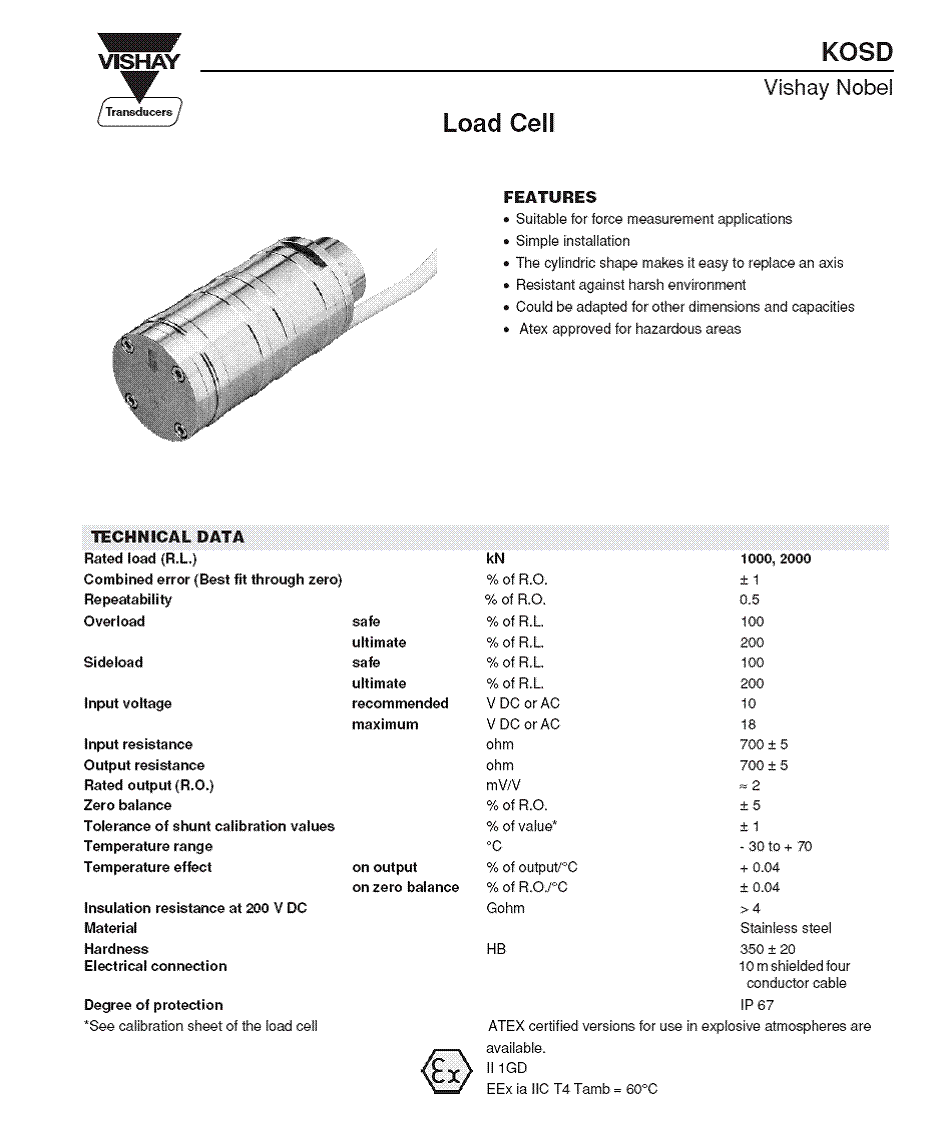 KOSD - 40稱(chēng)重傳感器具有堅(jiān)固的外殼,適合在惡劣環(huán)境中測(cè)力過(guò)載保護(hù)應(yīng)用。敏感元件包括三個(gè)部分,兩外部分構(gòu)成支持,中間部分是負(fù)載傳感的一部分。
